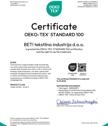 Beti tekstilna industrija d.o.o.je ponosen nosilec standarda OEKO-TEX 100 (od leta 2005) za nereciklirane in reciklirane materiale. Doslej je bil standard OEKO-TEX za ANNEX 4. Z letom 2024 pa je BETI d.o.o. razširila svoj certifikat na ANNEX 6 za nereciklirane materiale.